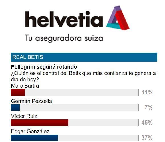 Sin embargo, la concepción que tiene la afición verdiblanca sobre Víctor Ruiz es altísima. Tanto es así que, en la #EncuestaHelvetiaED propuesta por ESTADIO Deportivo y en la que se preguntaba por el central del Betis que más seguridad transmite, el '6' fue la opción más marcada con un 45 por ciento de los votos. Tras él, con un meritorio 37 por ciento, aparece Edgar y, muy lejos de ambos, Marc Bartra (11%) y Pezzella (7%).
