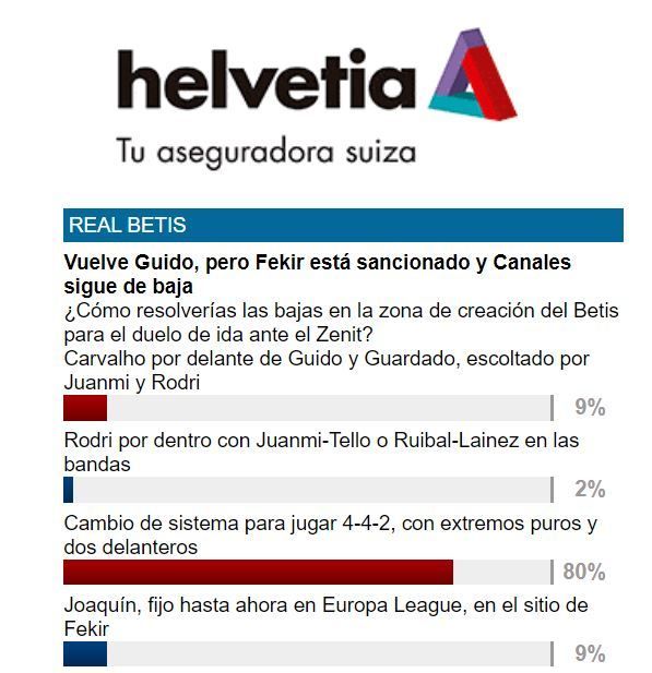 Sobre todo ello, la oportunidad de Joaquín y la opción de probar cosas nuevas en un partido sin las dos máximas figuras del Betis, ESTADIO Deportivo ha preguntado a sus lectores. Sólo un 9 por ciento de los participantes en la #EncuestaHelvetiaED se han mostrado partidarios de que el capitán ocupe el sitio de Fekir; el mismo volumen de los partidarios de adelantar al iluminado Carvalho para protegerle con Guido y Guardado en el doble pivote.