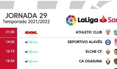 LaLiga ha dado a conocer en la tarde de este lunes los horarios de la jornada 29, previa al último parón Fifa de selecciones de la temporada, que tendrá el 'Clásico' de la segunda vuelta como colofón, por lo que ha quedado ya definido el mes de marzo completo. Para no perjudicar a ningún club en concreto, no habrá partido el lunes 21, cuando seguramente habrían fijado el Cádiz-Villarreal, que pasa a jugarse en la segunda franja del domingo 20, coincidiendo a las 16:15 horas con el Celta-Betis. Los dos conjuntos hispalenses, por cierto, volverán a jugar seguidos, uno detrás de otro, como viene siendo habitual últimamente. De esta forma, el Sevilla-Real Sociedad se disputará el mismo día a las 18:30 horas. El único andaluz fuera de esa jornada será el Granada, que visitará al Alavés el sábado 19-M a las 14:00 horas. La jornada completa queda como sigue: