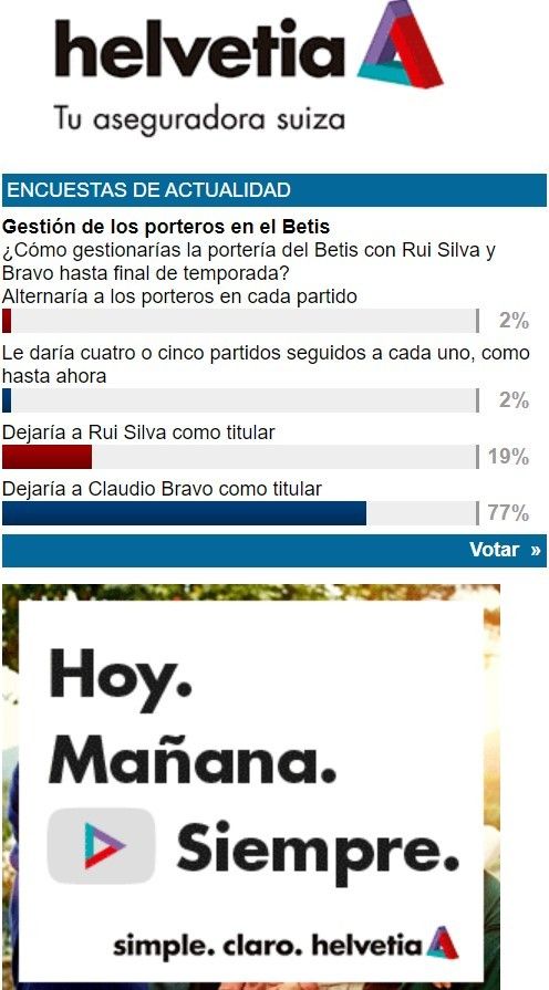 Por ello, y a la vista que la gestión de Manuel Pellegrini hasta el momento con la portería está siendo la de alternar los porteros cada varios partidos, en ESTADIO Deportivo hemos preguntado sobre la misma y si debería cambiar o no el técnico verdiblanco. Entre las varias opciones que había para elegir en nuestra #EncuestaHelvetiaED, precisamente la de alternar los porteros en cada partido o cada varios, como viene haciendo habitualmente Pellegrini, han sido las menos votadas, con un 2% cada una.