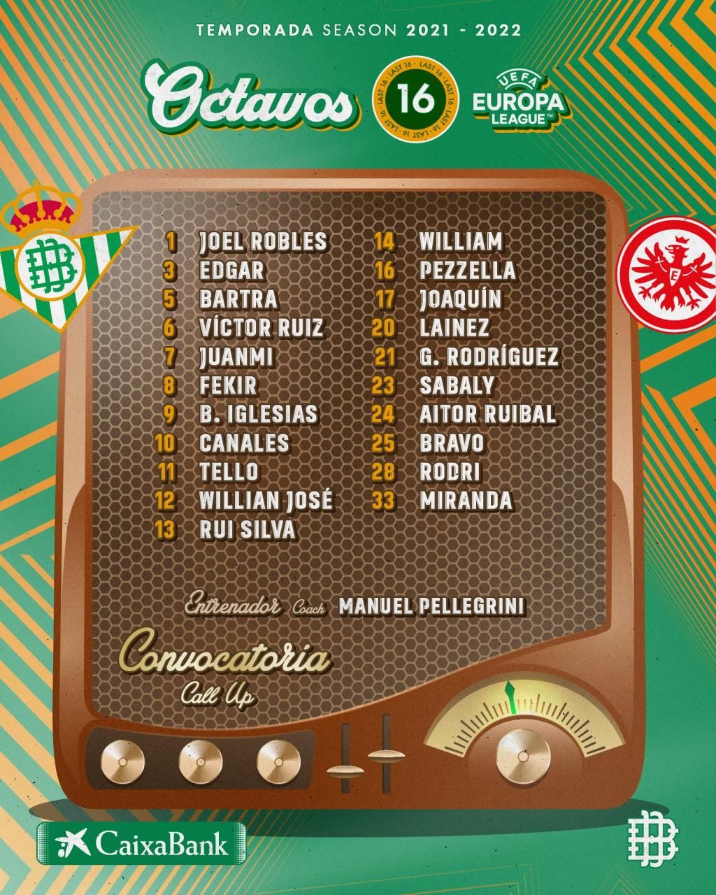 Así la lista con los 21 futbolistas convocados por Pellegrini para el duelo de ida de los octavos de final de la Europa League es la siguiente: Joel Robles, Edgar, Bartra, Víctor Ruiz, Juanmi, Fekir, Borja Iglesias, Canales, Tello, Willian José, Rui Silva, William Carvalho, Pezzella, Joaquín, Diego Lainez, Guido Rodríguez, Sabaly, Aitor Ruibal, Claudio Bravo, Rodri y Miranda.