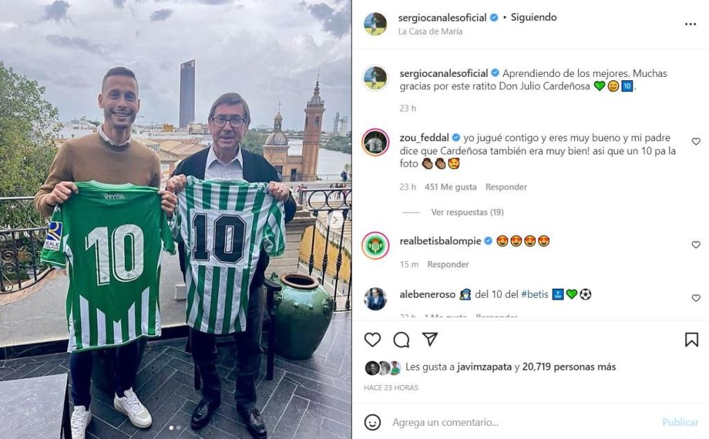 Si, además, les da por juntarse... pues más motivos para que los béticos se ilusionen. "Aprendiendo de los mejores. Muchas gracias por este ratito, Don Julio Cardeñosa", escribe el cántabro en su perfiles de Twitter e Instagram, un mensaje que se llenó de comentarios destacables. "Fotón", decía un ex del Betis como Benjamín Zarandona; aunque, sin duda, el texto que más 'Me Gusta' se llevó fue el que puso otro viejo conocido de la afición de La Palmera como es Zou Feddal (Sporting CP).