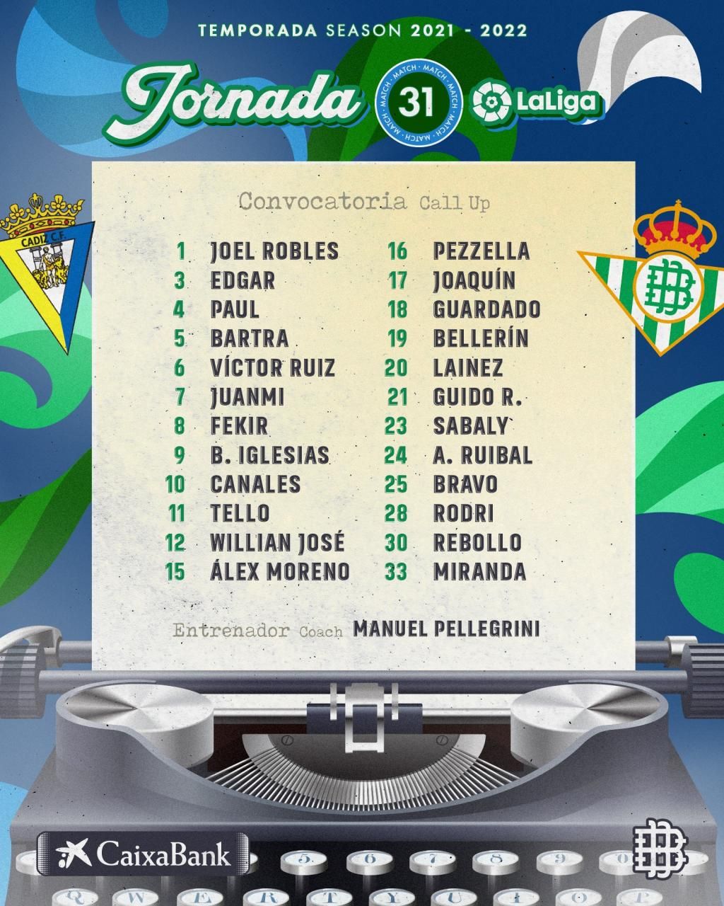 Para traerse los tres puntos de Cádiz, Pellegrini ha facilitado una lista de convocados compuesta por 24 futbolistas en la que destacan los regresos de los recuperados Sergio Canales, Borja Iglesias y Juan Miranda, así como de Nabil Fekir y Germán Alejo Pezzella, una vez cumplidas sus respectivas sanciones. También figura como novedad el portero del Betis Deportivo Dani Rebollo, quien se desplazará a la 'Tacita de Plata' como tercer portero.