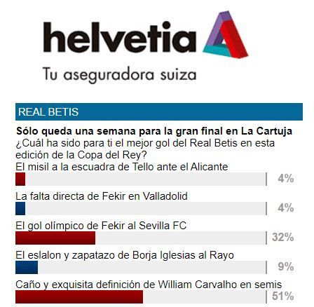 El luso-angoleño se ha llevado el 51 por ciento, más de la mitad de los votos, en la #EncuestaHelvetiaED con la que este periódico pulsaba la opinión de la hinchada verdiblanca. Segundo, aunque con mucha diferencia vendría en gol de córner directo de Fekir al Sevilla FC, elegido por un 32% de los participantes, y cerraría el podio de golazos el de Borja Iglesias con un 9%. El libre directo del '8' del Betis en Valladolid y el zapatazo de Tello en tierras levantinas acumularon un 4% cada uno.