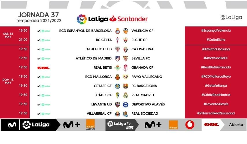Y es que, dado que no se juegan nada, al no tener los contendientes posibilidades de descender u obtener plaza de competiciones europeas, LaLiga estableció que el Espanyol-Valencia se juegue el sábado 14 de mayo, a las seis y media de la tarde, al tiempo que el Celta-Elche se disputará a las 21:00 horas. Este giro fue posible por la certificación, por ejemplo, de la permanencia ilicitana, a pesar de la derrota en casa por 0-2 frente al Atlético de Madrid. Conservan su agrupamiento inicial, aunque una hora más tarde, los otros ocho compromisos, donde está en juego la salvación (con las tres posiciones de descenso aún sin asignar matemáticamente), la última plaza de Champions League (que será para Sevilla FC o Real Betis), las dos de Europa League y la de Conference League. Todavía no se conoce una posible variación de horarios en la última jornada, en parte porque es ya casi seguro que varios encuentros se saldrán de la unificación al no haber nada en disputa.