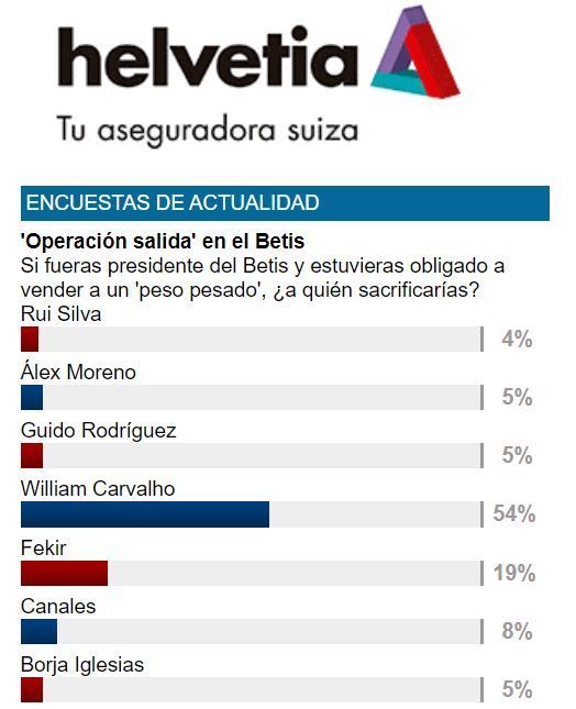 La mayoría de los participantes en el sondeo se ha decantado por 'sacrificar' a William Carvalho, para poder mantener a Guido Rodríguez y ante la opción de que el polivalente Sergio Canales ocupase ese rol de acompañante del pivote y dejase el extremo para alguno de los refuerzos ofensivos que se esperan, al margen de la llegada del prometedor Luiz Henrique.