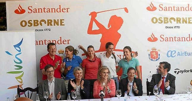 La presentación de la segunda prueba del Santander Tour ha tenido lugar este martes en el Club Zaudín Golf presidida por Virginia Martínez de Murguía, directora de Patrocinios del Banco Santander; Isabel Guisado, directora gerente del Club anfitrión; Candelaria Flores, presidenta del Comité Femenino de la Real Federación de Golf Andaluza; Pelayo Castillo, director comercial de Banca Privada del Banco Santander en Andalucía; Enrique de Álava, investigador principal de la Fundación María García-Estrada en el Hospital Virgen del Rocío de Sevilla; Carlos García-Hirschfeld, director general de La Nuez responsable de la organización del Santander Tour; y las profesionales de golf Virginia Espejo-Saavedra, Marta Silva, Mayte Vizcarrondo y Gemma Fuster.