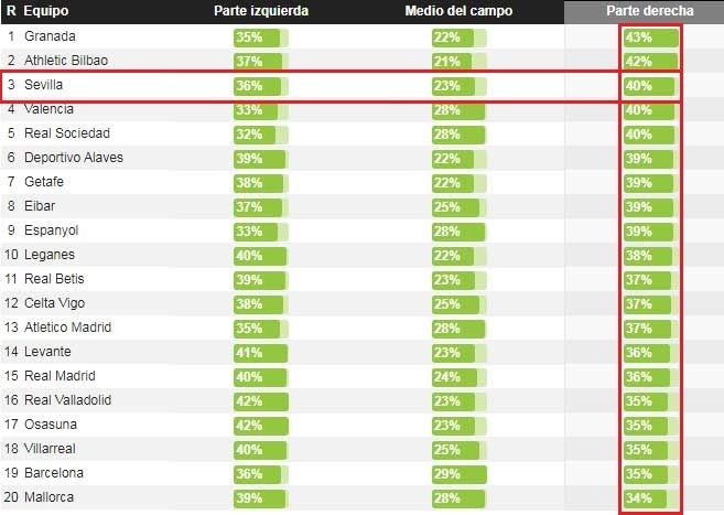 Sólo Granada CF y Athletic Club vuelcan más el juego a la derecha que el Sevilla FC, de los equipos de LaLiga que menos profundiza por la izquierda.