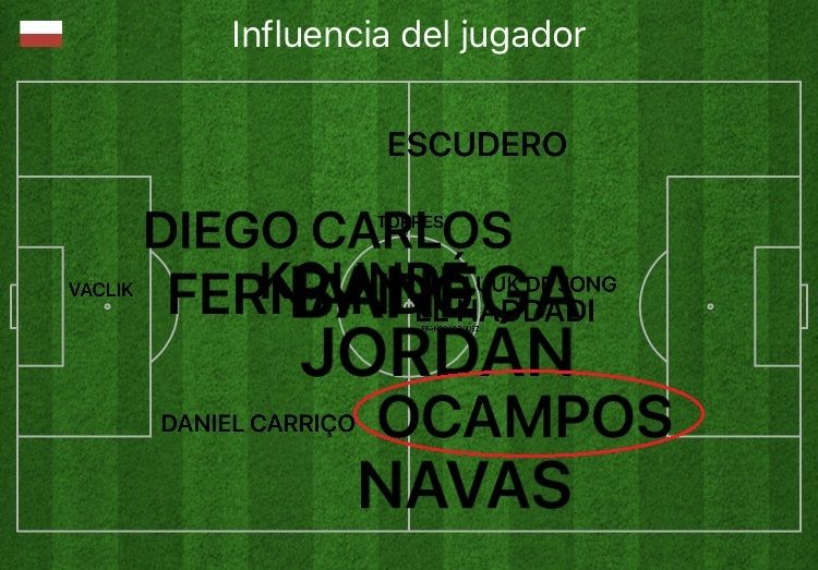 En el mapa de influencia de los jugadores del Sevilla el pasado viernes se aprecia la escasa profundidad de los blanquirrojos, en general, y que sólo Ocampos, ayudado por Navas, suele alcanzar la línea de fondo con la pelota jugada.