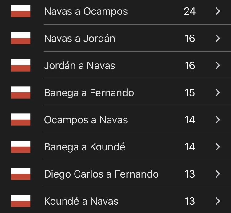 Las combinaciones ante los 'leones' muestran, por otra parte, que el pase de Navas a Ocampos es el más común en el Sevilla y que la mayoría busca al palaciego en la salida para que, junto al argentino, trate de llevar el balón hasta el otro campo. Y no es que deba dejar de hacer algo que le funciona, a través de dos futbolistas físicamente privilegiados, sino que como único argumento para buscar el área rival resulta muy pobre, fácil de contrarrestar por parte de los rivales. Por eso, da igual el delantero que juegue y por eso lleva el equipo tan pocos goles, muchos de ellos a balón parado.