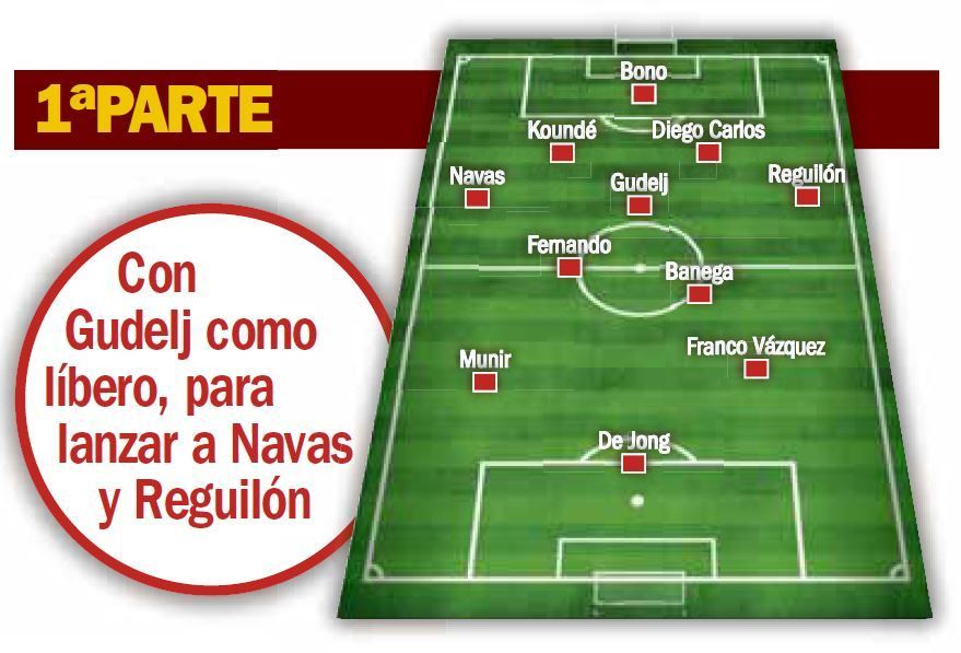 Se debatía desde que salieron las alineaciones si lo del Sevilla FC iba a ser un 4-3-3 o un 3-5-2, y a poco de comenzar el encuentro ya pudo apreciarse que era un poco de todo. Lopetegui había mandado a Gudelj que fuese una suerte de líbero, alguien que fluctuase entre el puesto de central y el de pivote, dependiendo de qué equipo tuviese el balón y en qué zona del campo.