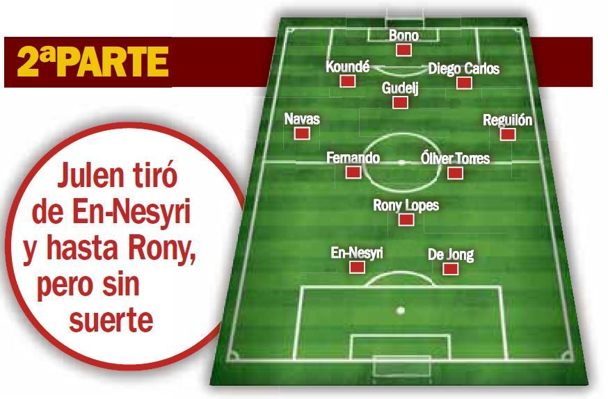 Y lejos de ser el rival miedoso y deshilachado de siempre en el Santiago Bernabéu, el nervionense se mostró desde el inicio como un conjunto bien plantado, con personalidad, que ocupaba convenientemente los espacios e iba dejando la sensación de saber qué disfraz le tocaba ponerse en cada momento. Funcionaba como de manera automática, con movimientos certeros, incluso en la salida, pese a la presión alta de un Real Madrid que regresaba al 4-3-3 y con muchas novedades. Demasiadas para enfrentarse al cuarto de la tabla, quizás.