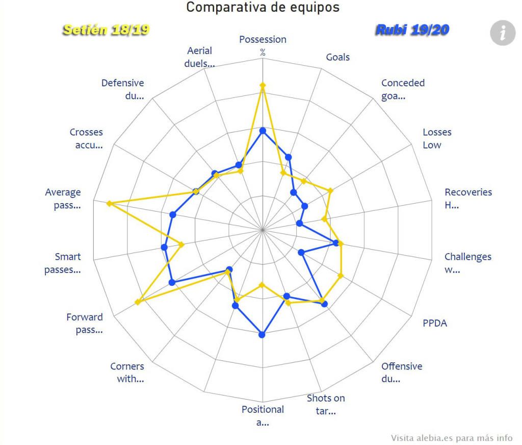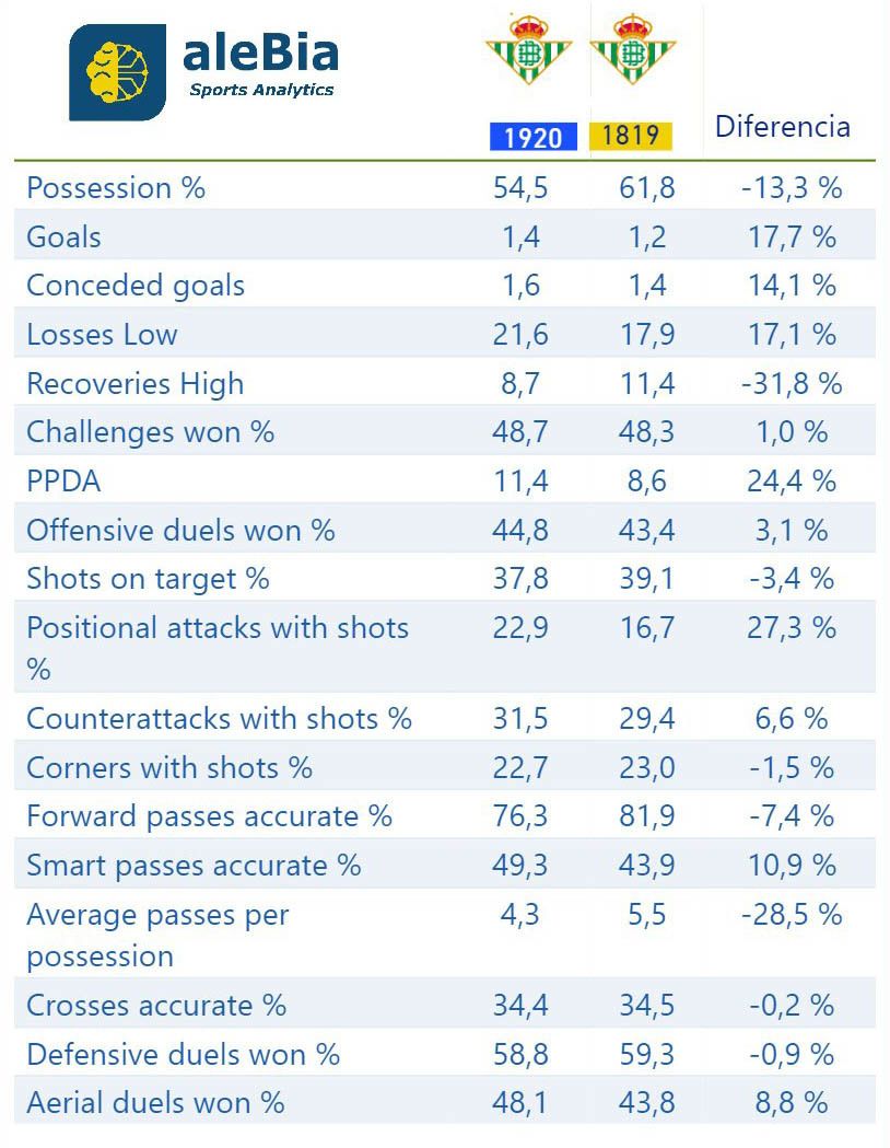 En la comparativa aportada por @AlebiaAnalytics, se aprecia, pues cómo el Betis de Rubi da muchos menos pases por posesión que el de Setién (-28,5%) y necesita menos balón (-13,3%) para ganar más duelos ofensivos (3,1%), acabar más jugadas acciones elaboradas con disparo (27,3 %) y más goles (17,7%), aunque del lado contrario el cuadro verdiblanco de la 19/20 pierde más balones (17,1%) y recupera menos (-31,8%), lo que ha propiciado que esté encajando más goles (14,4%) que en la época de su antecesor.