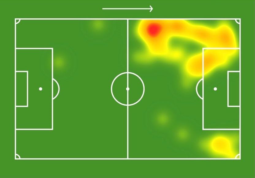 Pero el canterano nervionense no es un gambeteador al uso. Es decir, no regatea en función de lo que va sucediendo, sino que encara ya con una intención, sabiendo leer qué necesita cada jugada y sacando rédito de todas ellas. No en vano, creó hasta cinco ocasiones, disparó tres veces sobre la portería de Bono y una se estrelló contra el palo. Recibe, se gira y encara, con la idea siempre de pisar el área, donde, por miedo a derribarle, el defensa, que no ha dejado de recular, ya casi está obligado como mucho a intentar tapar su lanzamiento o su pase. Su mapa de calor deja claro que es profundo no sólo hasta la línea de fondo, sino hasta el portero.