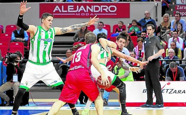 El ala-pívot del Tecnyconta Zaragoza Simon Pursl intenta pasar ante los jugadores del Real Betis Bostjan Nachbar y Tomeu Rico.R. S.