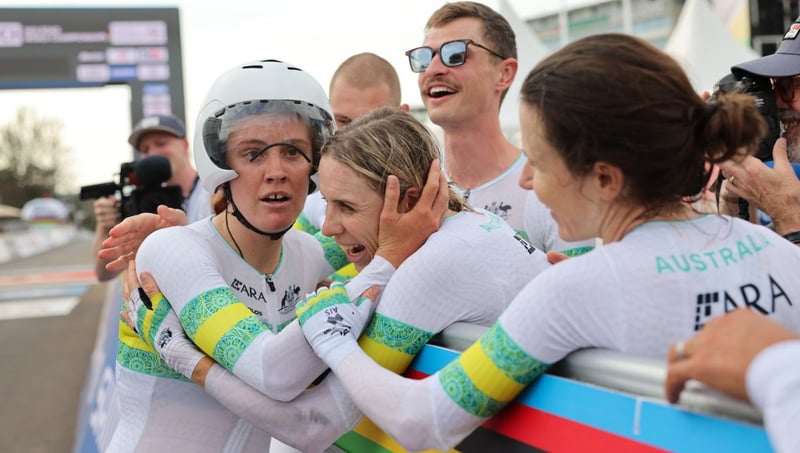 Por detrás acabaron sorprendentemente los franceses, a sólo cinco segundos, mientras que tercera fue una Suiza que, de no haber tenido un problema mecánico con su bicicleta la campeona del mundo Marlen Reusser, posiblemente, se habían impuesto en esta especialidad. Los suizos, pese a ese retraso, acabaron a sólo diez segundos de Australia y a cinco de Francia.