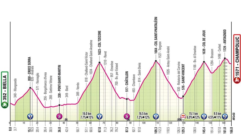La 19 etapa entre Biella y Champoluc son 166 kilómetros de subidas y bajadas. Con sólo decir que, a los cuatro kilómetros, ya llega la primera dificultad con la subida a Croce Serra...