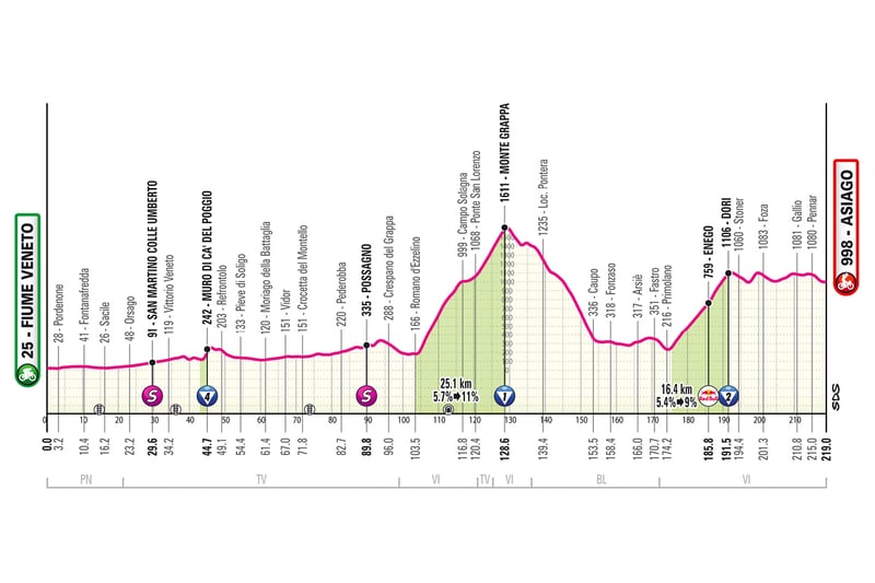 La 15ª etapa del Giro de Italia 2025 supondrá la última del segundo bloque de carrera, el cual se cierra con dos grandes ascensiones; eso sí, sin llegada en alto. De este modo, a mitad de recorrido se subirá el mítico Monte Grappa, 25,1 kilómetros entre el 6 y el 11 por ciento de pendiente. La cima de tal coloso llegará a 70 kilómetros de meta, por lo que será difícil ver a los implicados en la clasificación general meterse en la pelea. La llegada tendrá lugar en Asiago, coronándose el último puerto a unos 28 kilómetros de la línea de meta.