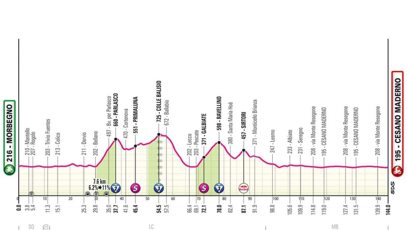 Los tres puertos están muy seguidos, lo que podría propiciar algún tipo de ruptura, aunque luego hay más de 60 kilómetros hasta la meta para neutralizar a los aventureros. El primer alto es el de Parlasco (2ª categoría, 7,6 km al 6,2%, con una máxima de un 11 %). Luego llegarán dos de 3ª categoría: Colle Balisio y el Ravellino.