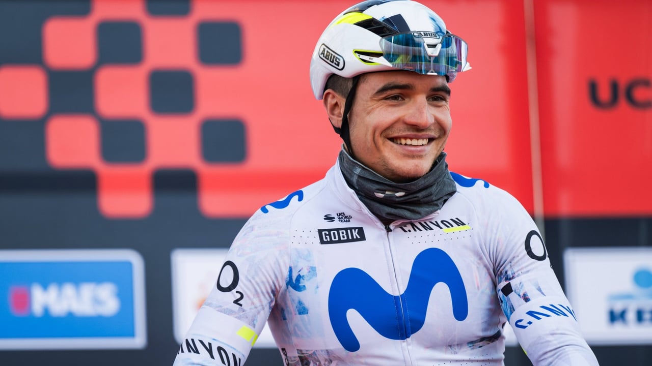 Carlos Canal, ciclista del equipo Movistar, sonriente tras una carrera de 2026.IMAGO