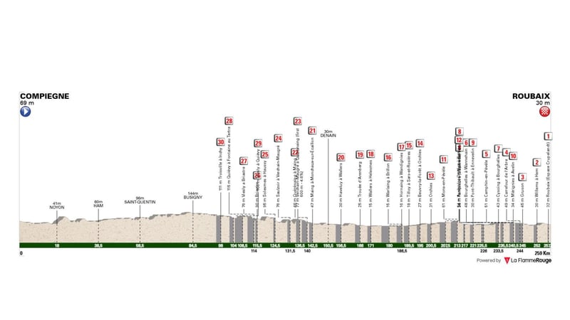 La París-Roubaix 2026 cuenta con un recorrido de 258,2 km, en el que incluye 30 tramos de los temidos adoquines, que suman 54,8 km de la carrera. Entre ellos se encuentran los célebres tramos de cinco estrellas de la Trouée d'Arenberg, Mons-en-Pévèle y Carrefour de l'Arbre, los más difíciles del día.