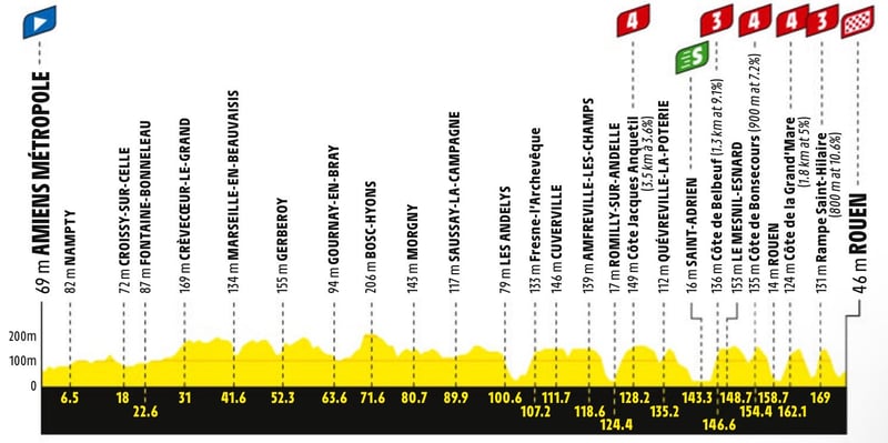 La 4ª etapa del Tour de Francia 2025 supone una clara oportunidad para que los cazadores de victorias brillen. Con un recorrido de 173 kilómetros, el Tour plantea para esta jornada un territorio rompepiernas que se vislumbra como perfecto para dar forma a una fuga que será muy difícil de controlar, ya que los repechos se sucederán hasta llegar a unos 45 kilómetros finales con hasta cinco cotas de tercera y cuarta categoría, siendo la última de estas un verdadero muro con una pendiente que llega a alcanzar hasta el 15 por ciento. Ante tal perfil es posible que algún corredor con aspiraciones en la clasificación general trate de sorprender al resto.