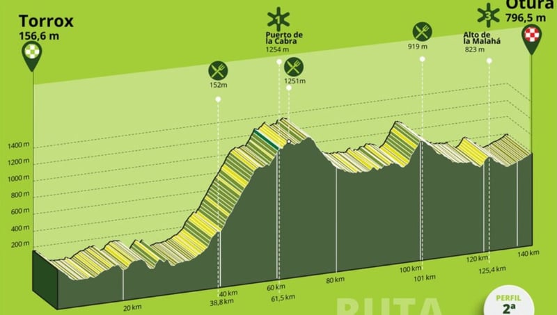 La segunda etapa de esta Ruta del Sol 2026 parte de la Avenida del Faro de Torrox (Málaga) y entrará pronto en tierras granadinas, donde se desarrollará la mayor parte de la jornada y en la que estarán los puertos de montaña de la Cabra, de primera categoría, y el de La Malahá (3ª categoría), que está situado a 20 kilómetros de la meta y que puede decidir la etapa.