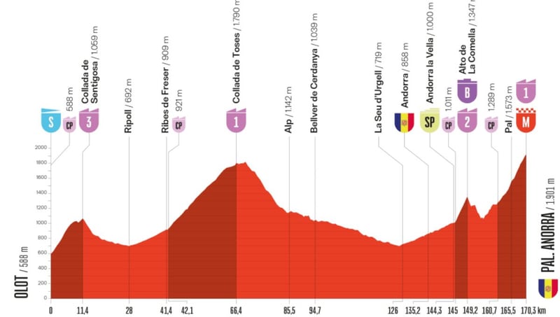 La carretera se empina casi desde la salida con un puerto de Tercera, Sentigosa (11 km al 4% de desnivel), luego llega la larga ascensión a la Collada de Toses (1ª categoría; 24 km de ascenso y 3.5%); tras esto llega La Comella, un puerto de 2ª categoría, corto y muy duro, de 4,2 km al 8% ; y, por último, la carrera finaliza en el Coll de Pal (1ª categoría; 9,6 km al 6,3%). El puerto de La Comella repartirá las bonificaciones intermedias de la jornada, lo que augura lucha entre los favoritos.