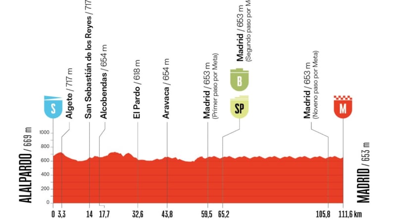 Sólo 111 kilómetros separan la salida de Alalpardo de la llegada en Madrid y no hay ninguna dificultad. Lo único llamativo será el sprint intermedio a 40 kilómetros de meta, ya dentro de la capital de España.
