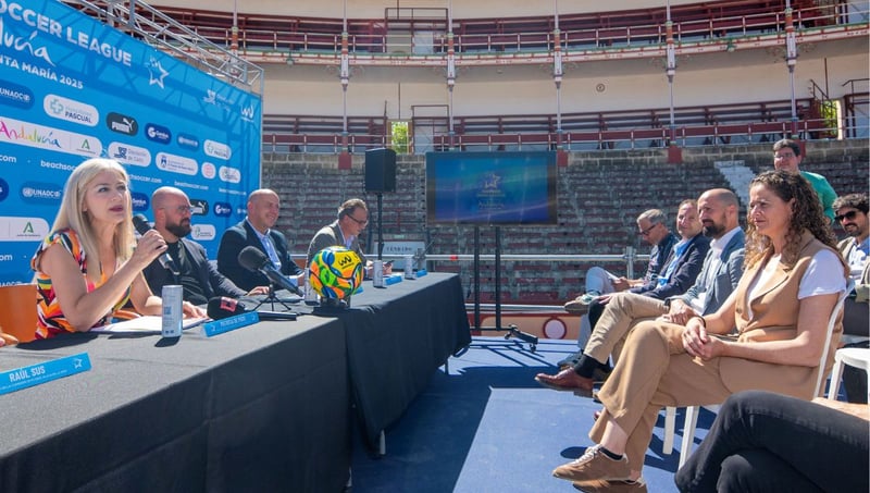 La consejera de Deportes, Patricia del Pozo, presenta una Euro Beach Soccer League que tiene la Plaza de Toros de El Puerto de Santa María como sede y en la que estarán las mejores selecciones nacionales europeas masculinas y femeninas de fútbol playa