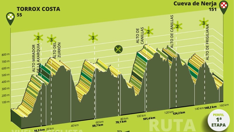 La primera etapa consta de 160 km con salida del municipio malagueño de Torrox Costa y llegada en la Cueva de Nerja, en la localidad del Balcón de Europa. Una ruta por la Axarquía, sus preciosos parajes y sus duros perfiles.