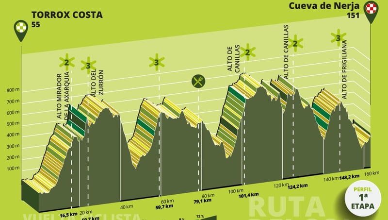 Son un total de 162 kilómetros entre la salida, en Torrox-Costa, y la llegada en la Cueva de Nerja, que servirán para abrir boca. Aunque, si tenemos en cuenta la dureza con la que empieza la carrera, los ciclistas no se podrán parar mucho a recrearse. De hecho, se trata de la etapa reina de esta 71ª edición de la ronda andaluza. Se pasará por cinco puertos de montaña: el Alto Mirador de la Axarquía (2ª categoría), el Alto del Zurrón (3ª) en Sedella, el Alto de Periana, de 3ª categoría, el Alto de Canillas de Aceituno (2ª categoría) y el alto de Frigiliana (3ª).