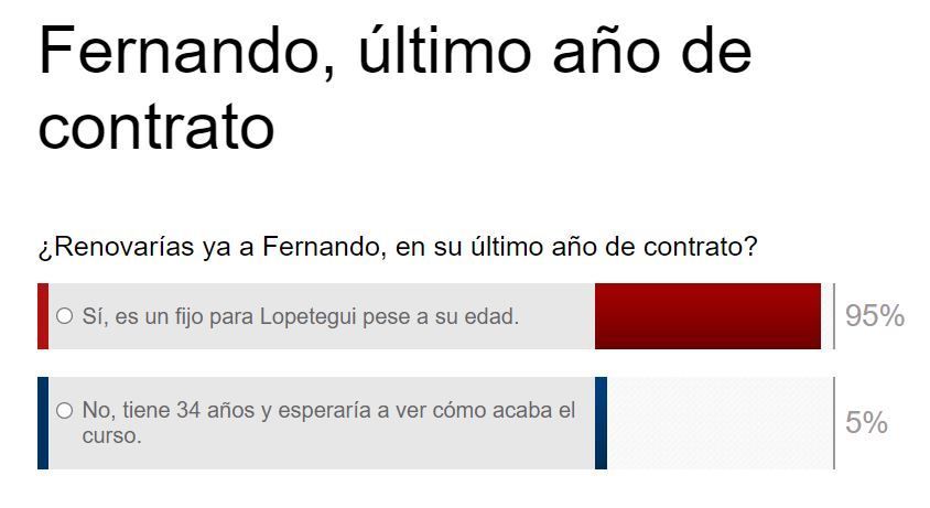 A raiz de ello, en ESTADIO Deportivo hemos querido consultar a los sevillistas cuál es su opinión, realizando una encuesta en nuestra web. Si renovarían ya al brasileño o si, en cambio, esperarían a ver cómo evoluciona la temporada y cuál acaba siendo su papel. Sin lugar a dudas, en Nervión lo tienen claro. Mucho más que el propio Fernando. Tanto, que el 95% de los encuestados ha optado por el 'sí', renovándolo ya como pieza clave que es del Sevilla FC.