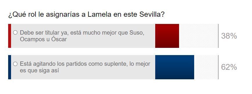 Y el sevillismo ha hablado, estando, en cierta manera, de acuerdo con Lopetegui. Pues el 62% de los encuestados optan por no tocar lo que funciona y, por tanto, seguir utilizando al argentino como el revulsivo que ha demostrado ser en este inicio de campaña. Viene agitando los partidos desde el banquillo y lo mejor es que siga así, opinan.