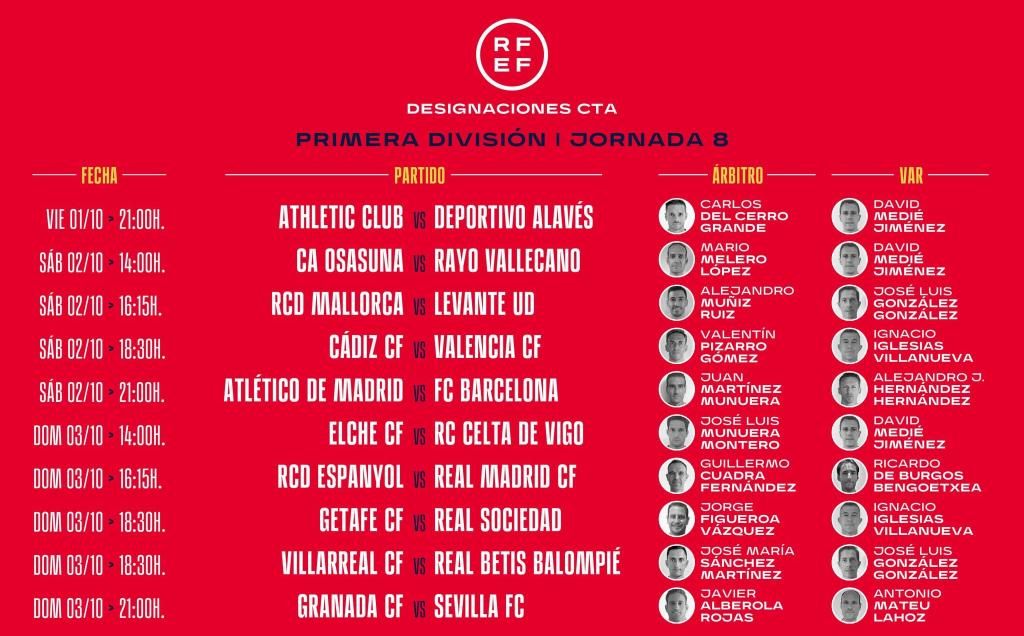 El Comité Técnico de Árbitros (CTA) de la Federación Española de Fútbol (RFEF) ha anunciado la designación de los árbitros para la octava jornada de LaLiga, en la que el Betis se medirá al Villarreal y el Sevilla FC visitará al Granada.