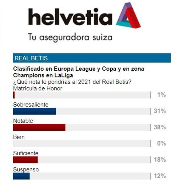 Ése sexto puesto liguero al final de la pasada campaña, cuando el Betis empezó el año en la zona media-baja de la tabla, y la tercera plaza en el campeonato actual hace que los aficionados hayan valorado el 2021 del Real Betis como notable alto, cercano al sobresaliente. Así lo expresaron en la #EncuestaHelvetia, donde dejan claro que están muy satisfechos con todo lo realizado este año que ahora acaba.