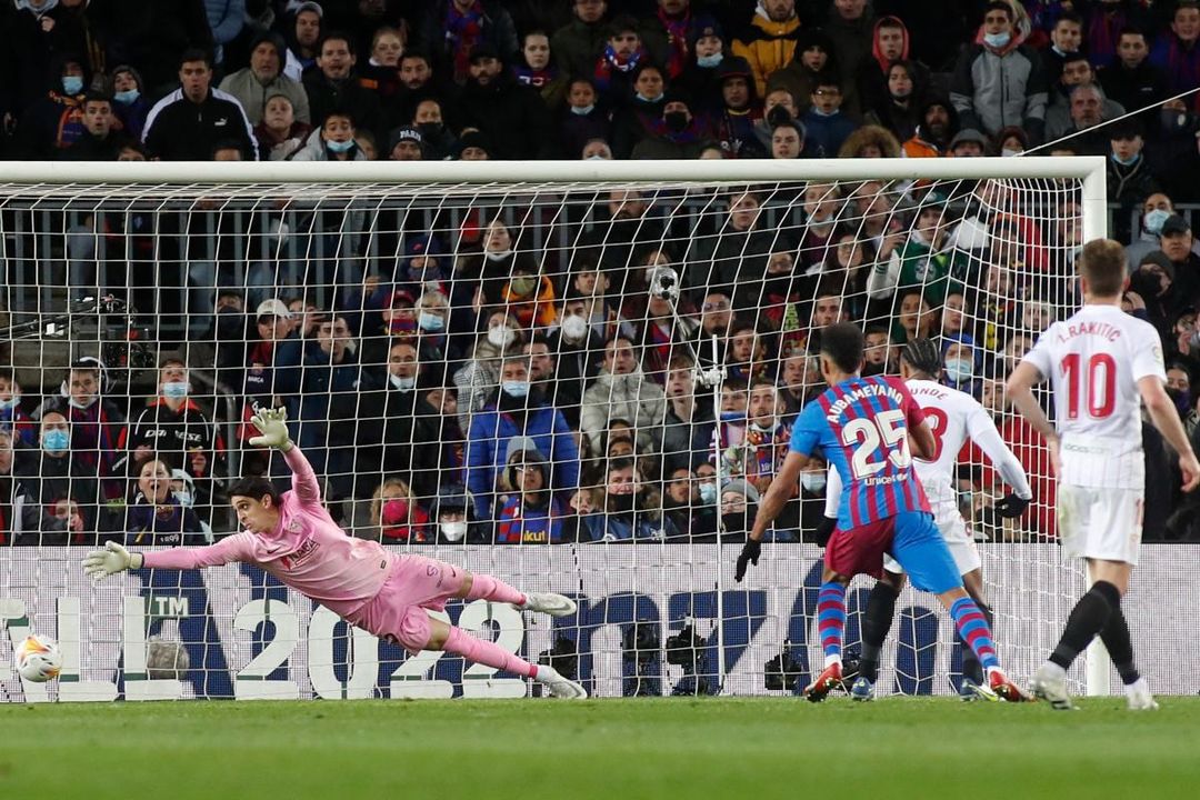 Así hizo recular un poco al bloque del Sevilla FC, obligado a retroceder con la amenaza de las conducciones del ambidextro Dembélé, con varios centros peligrosos como el que cabeceó mal De Jong en boca de gol y con una gran diagonal de Ferran Torres, que en el 7' controló la pelota pegada a la banda izquierda para internarse y buscar la escuadra con un derechazo que le salió demasiado alto. El internacional español, con una volea fallida en el 39', fue el primero en tirar entre los palos, pero Bono la embolsó sin apuros.