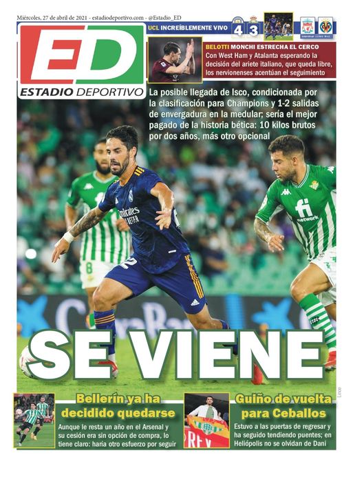 La posible llegada de Isco, condicionada por la clasificación para Champions y 1-2 salidas de envergadura en la medular; sería el mejor pagado de la historia bética: 10 kilos brutos por dos años, más otro opcional