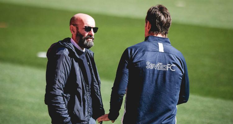 Monchi conversa con Lopetegui durante un entrenamiento.