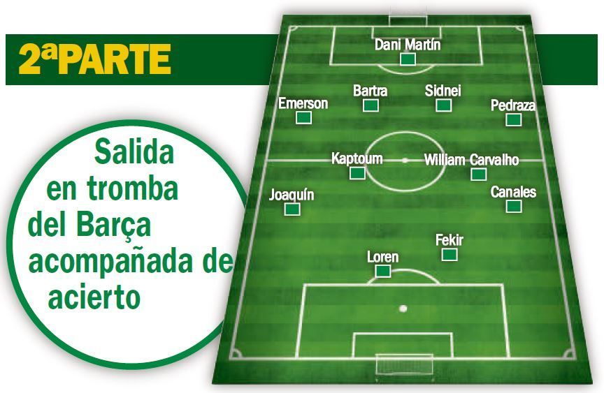Con 0-1, al Betis le faltó la precisión y personalidad del curso pasado para hacer más daño mientras que el Barça fue coleccionando acercamientos hasta que Griezmann empató tras un servicio perfecto de Sergi Roberto. Antes de que el Betis entrara en el partido en el segundo acto ya se vio por detrás en el marcador y ahí claudicaron los de Rubi, que entregaron el choque sin un plan B para revitalizarse ni argumentos para toser a un Barcelona netamente superior, que acabó goleando.