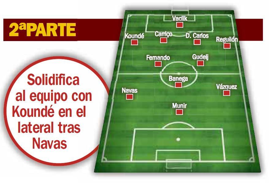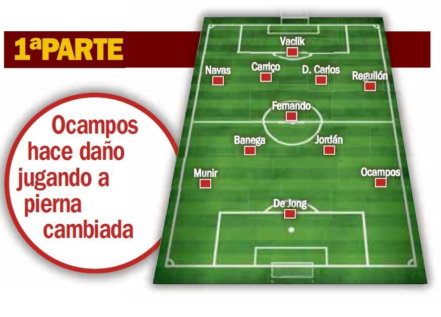 Lopetegui salió lo mejor que tiene con la novedad de jugar con Munir y Ocampos a pierna cambiada. El argentino explotó esa condición y casi todas sus intervenciones incluyeron diagonales hacia dentro y finalizaciones con disparos a puerta. Estuvo bien escoltado por Reguilón, aunque al lateral le faltó precisión en los centros. Ellos pusieron la verticalidad en un equipo al que le falta una marcha más en la circulación para sorprender con más asiduidad al rival.