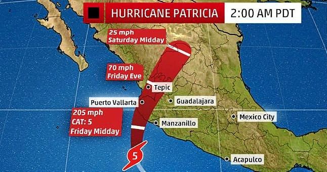 La llegada de 'Patricia' a México tendrá lugar sobre la ciudad de Puerto Vallarta (Jalisco) en un plazo de 12 a 18 horas, según el rumbo y velocidad actuales, y lo hará sin perder intensidad respecto a los datos que se registran hasta ahora, según los pronósticos de 'The Weather Channel'.