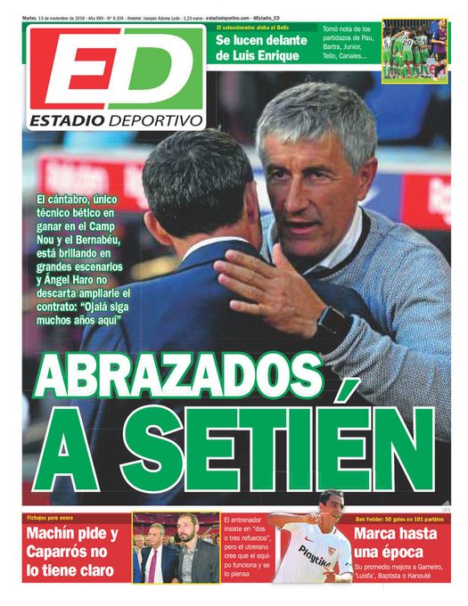 ABRAZADOS A SETIÉN. El cántabro, único técnico bético en ganar en el Camp Nou y el Bernabéu, está brillando en grandes escenarios y Ángel Haro no descarta ampliarle el contrato: "Ojalá siga muchos años aquí".