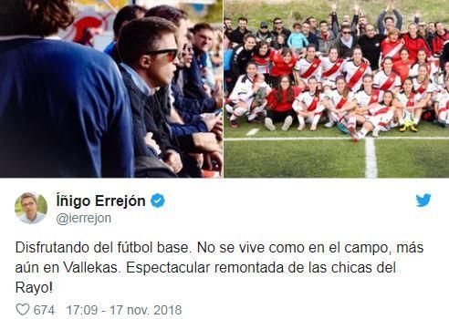 Íñigo Errejón quiso compartir en las redes sociales su experiencia presenciando el partido de la Liga Iberdrola entre el Rayo Vallecano y la Real Sociedad y acabó recibiendo una oleada de zascas por su desconocimiento del mundo del fútbol. El político calificó de "fútbol base" un partido de la Primera división femenina y no tardó en recibir la contestación de los usuarios.