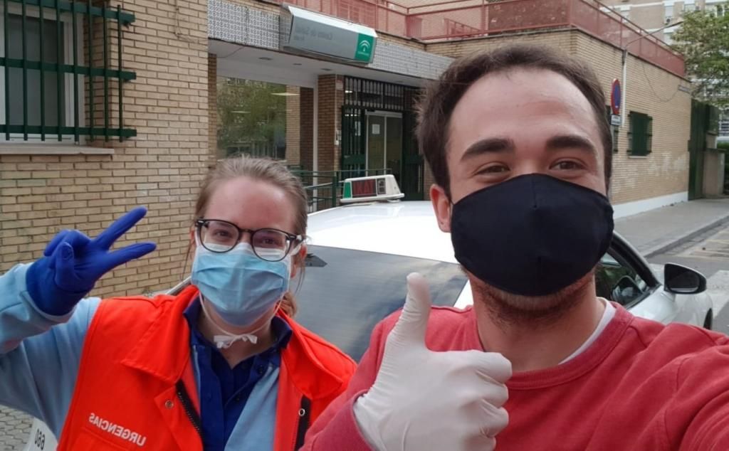 Uno de los taxistas "solidarios" de Sevilla junto a una profesional de la sanidad transportada.R. S.