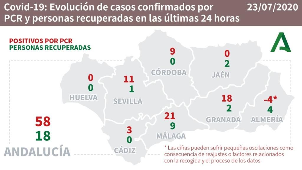 Andalucía no suma este jueves ningún fallecido por Covid-19 en una jornada en la que registra seis nuevos hospitalizados sin nuevos ingresos en Unidad de Cuidados Intensivos (UCI), y con 58 casos por PCR en 24 horas, la mitad de los 117 registrados el miércoles, mayor aumento diario desde el mes de abril.