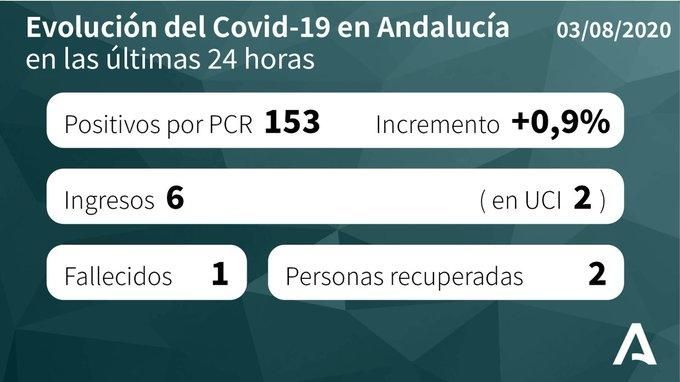 Andalucía ha registrado un fallecido más por Covid-19 este lunes y suma seis nuevos hospitalizados, dos más en UCI, y 153 casos por PCR en 24 horas, cifra menor a los 183 del domingo y a los 186 del sábado, que era el mayor aumento diario al menos desde abril.