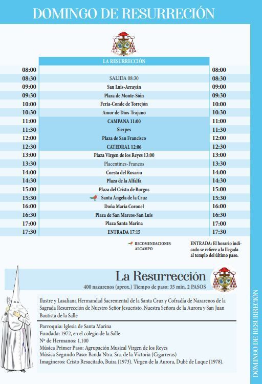 La resurrección saldrá a las 8:30 horas de la Iglesia de Santa Marina para hacer su estación de penitencia. Llegará a Campana a las 11.00 horas y cerrará las procesiones de la Semana Santa de Sevilla 2022 con su recogida a las 17:15 horas.La Resurrección tiene uno 400 nazarenos, dos pasos (Cristo Resucitado y Virgen de la Aurora) y tarda unos 35 desde su inicio hasta su final.