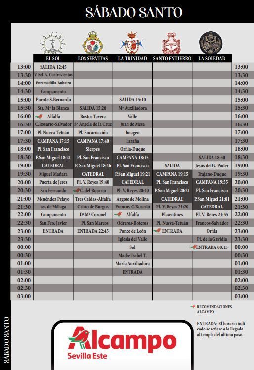 El Sábado Santo, tras el intenso Jueves Santo, la mágica Madrugá y el Viernes Santo, toman las calles cinco hermandades, las cuales embellecerán las calles de la capitas hispalense. El Sol, Los Servitas, La Trinidad, Santo Entierro y La Soledad harán disfrutar a los seguidores de la Semana Santa durante este penúltima día de la misma.Itinerario y horarios de El Sol