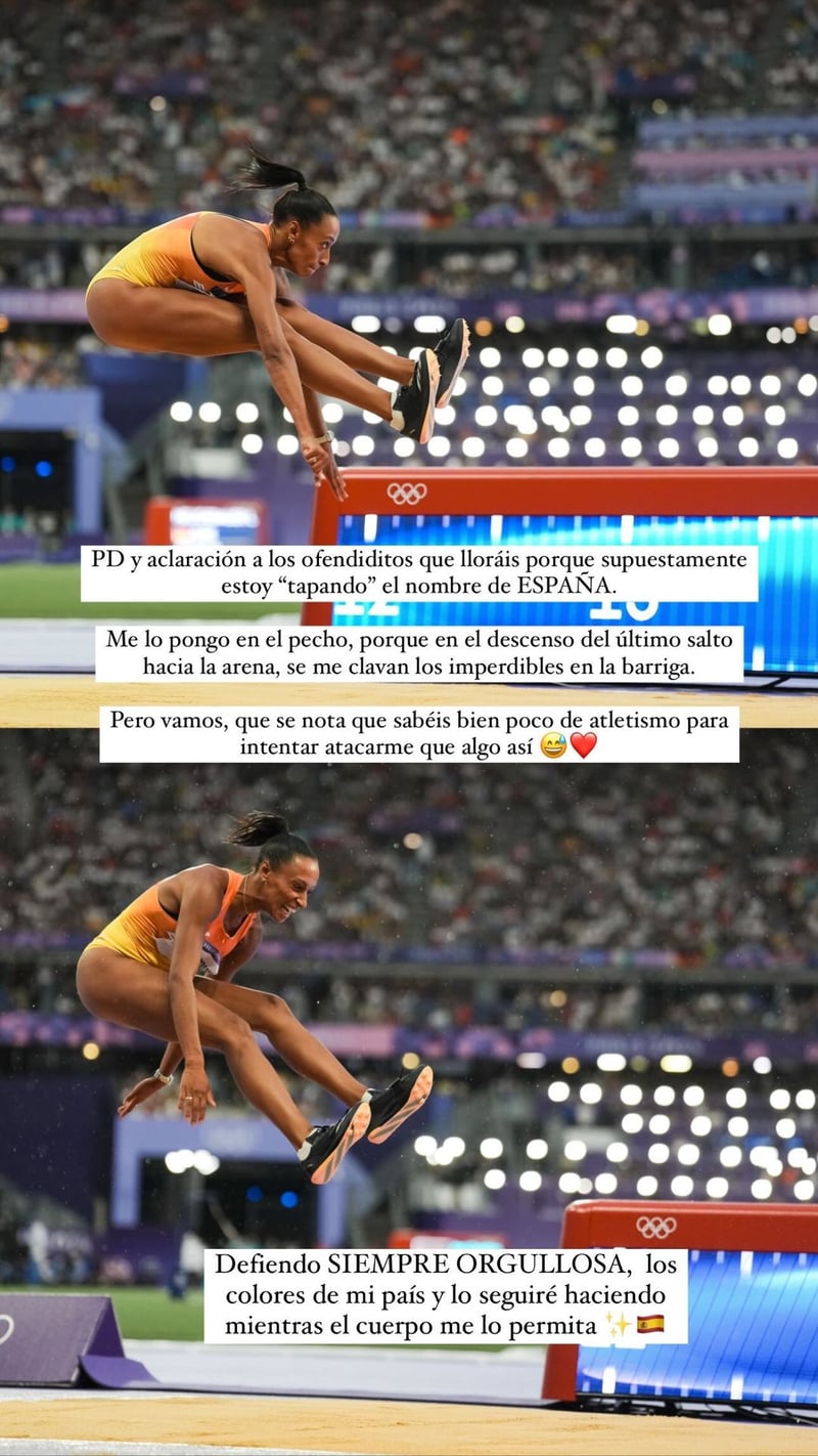 En las últimas horas ha publicado un 'storie' en Instagram donde daba a entender su decisión de poner el dorsal justo por delante del lugar donde pone España. "Me lo pongo en el pecho porque, en el descenso del último salto hacia la arena, se me clavan los imperdibles en la barriga", explicó los motivos la atleta en su Instagram. Antes de ello, les tildó de "ofendiditos" a los que le criticaban por ello y aseguró que ella siempre defiende "orgullosa" los colores de España. Lo hará "hasta que el cuerpo lo permita", según pone de manifiesto en su red social.
